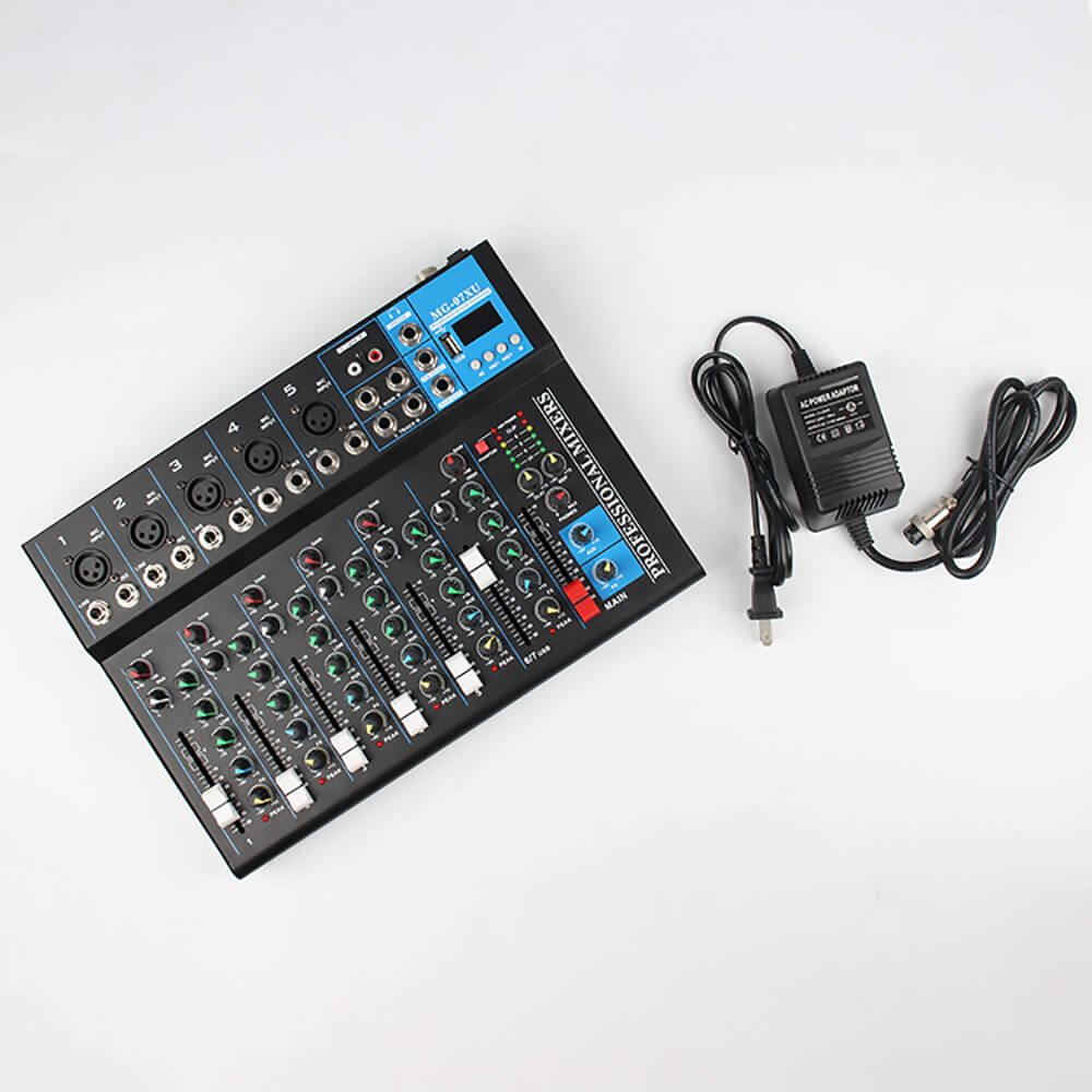 Микшерный пульт 7-ми канальный J.I.Y MG-07XU цифровой подойдет для микрофона, для вокала, для компьютера, для колонок как в условиях студии, так и дома. Звуковой домашний беспроводной микшер громкости с блютузом имеет удобную панель управления с поворотными регуляторами, на которых установлены прорезиненные накладки. Музыкальный микрофонный bluetooth стерео микшер для звука оснащен микрофонными входами, которые защищены от помех и возможных искажений. Всего в аудиомикшере предусмотрено 6 моновходов и 1 стереовход. На каналы подается мощность 48 Вт. Микшерный пульт может использоваться как с микрофонами проводными и беспроводными, так и с телефонами, планшетами и другими устройствами при соединении по блютуз.
